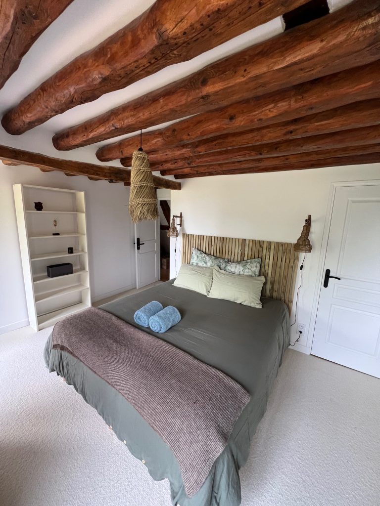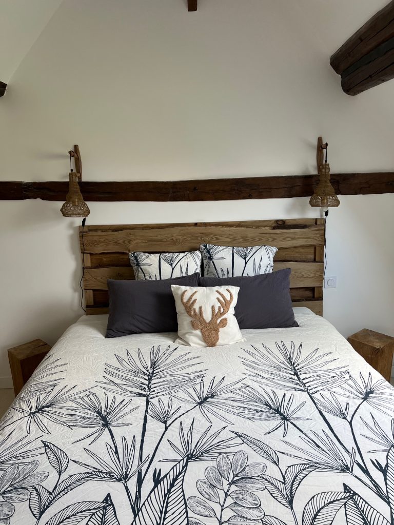 Les trois chambres d’hôtes – Cerf, Goupil, Mouton – offrent un confort rare au milieu des champs. Grandes literies hôtelières françaises avec le Matelas Français, silence total, peignoirs, chaussons, salles de bain privatives… En hiver, on se retrouve volontiers au coin du feu, dans le salon laissé aux voyageurs. Ici, on croise des chevreuils, on observe les moutons présents sur le domaine, on ralentit.