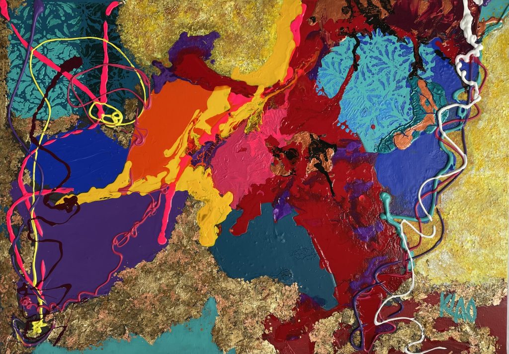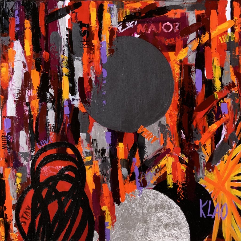 Parmi ses œuvres récentes, le tableau Magma occupe une place particulière et sera présenté avec l’association Adaïs au Salon des Indépendants à Art Capital, du 13 au 26 février 2026. Réalisée en acrylique, pouring, encres et médiums, cette pièce de 80 x 80 cm incarne parfaitement l’intensité et la force expressive de l’artiste. En parallèle, KLAO décline aussi son univers en dessins numériques imprimés, cartes postales, affiches ou en tote bags.