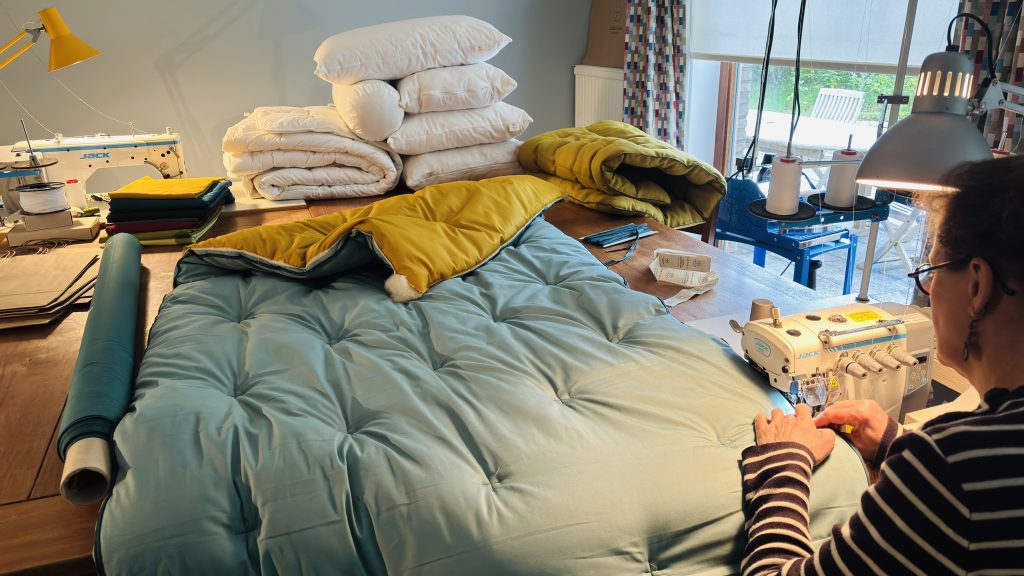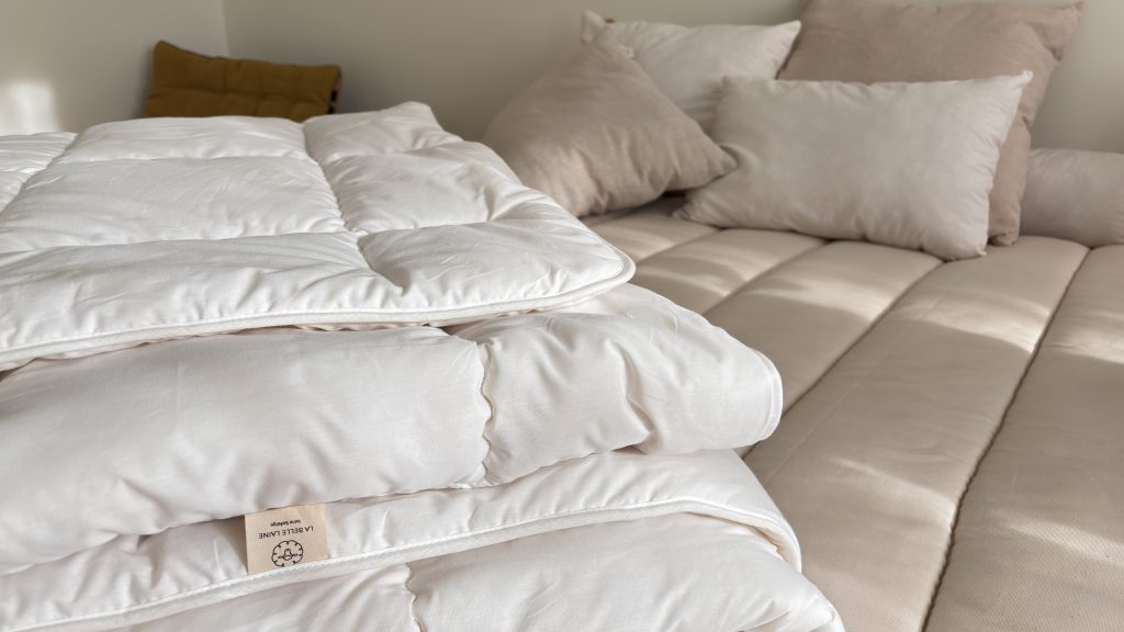 Depuis 2023, La Belle Laine s’est spécialisée dans la conception et la fabrication de produits de literie, parmi lesquels des couettes, des oreillers, des coussins, des surmatelas, des coussins d’allaitement, des traversins et bien d’autres. Le couple collabore exclusivement avec de petits élevages familiaux belges, en donnant priorité à des productions biologiques. Les toisons sont sélectionnées dès la tonte, et les races de moutons sont choisies pour la qualité de leur laine : peu feutrable, gonflante et idéale pour la literie.