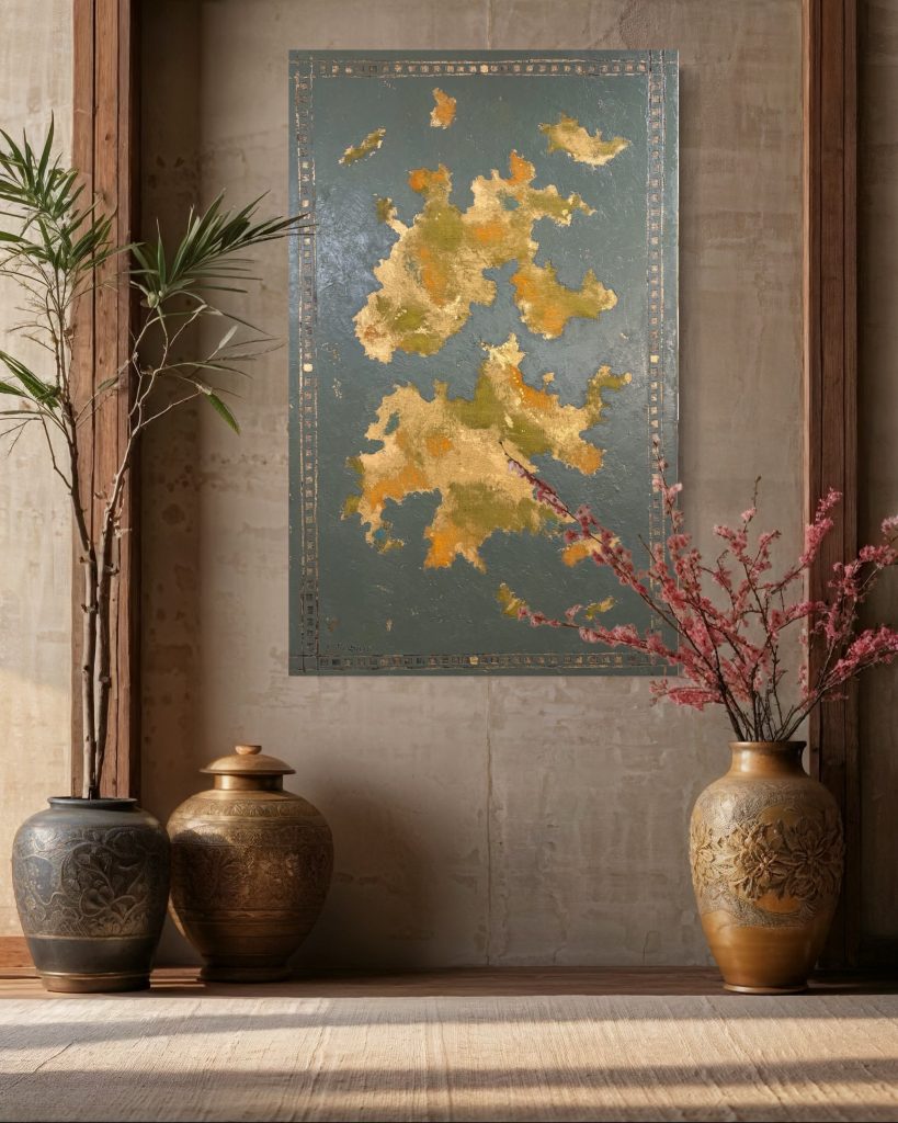 Inspirée par d’anciennes représentations du monde et les bouleversements qu’il traverse, la peintre confond continents et océans, questionnant la place de l’humanité sur sa planète. Les frontières sont floues et mouvantes, symboles d’une terre qui se transforme. Ces cartes ne représentent pas des endroits réels, mais des paysages de l’âme où chacun peut se projeter.