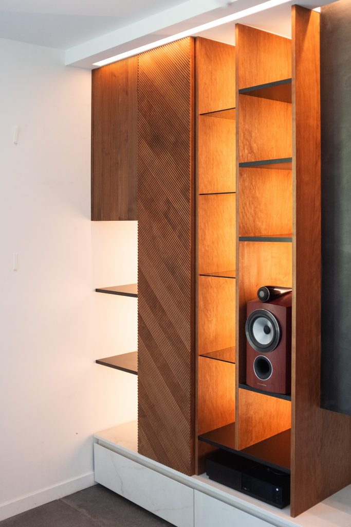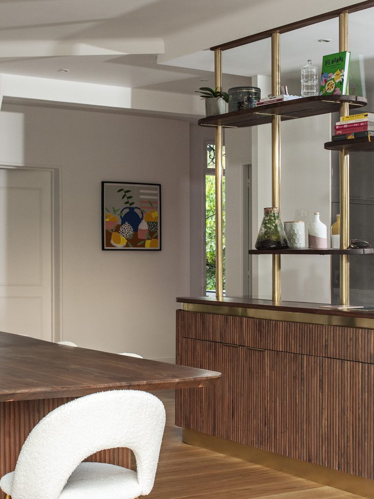 Il y a deux ans, l’Atelier proposait un intérieur en noyer américain et laiton dont les façades étaient recouvertes de papier d’écorce. La commande comprenait un challenge technique : une verrière en laiton dotée d’étagères traversantes.